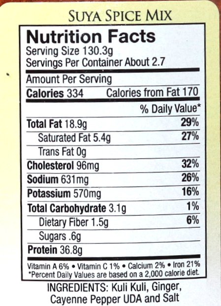 African Suya Spice Mix is a smoky, nutty, and spicy blend of ground Kuli Kuili, cayenne powder, ginger and spices used to season the popular West African street food. It adds a bold, savory, and slightly spicy flavor to grilled meats, making it a perfect seasoning for barbecues and roasted dishes.